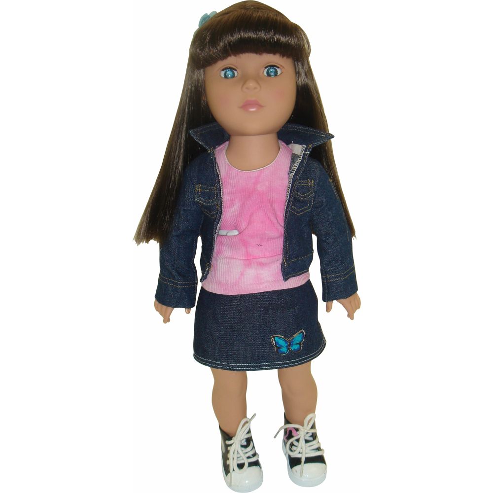 I was sent one "Olivia" to review and giveaway. Olivia sports a denim jacket with yellow contrast top stitching and two front flap pockets. Pink tie dye rib knit tank top. Denim skirt with contrast yellow top stitching and blue butterfly applique at wearer's front lower left. Doll is 18" tall and includes headband, tank top, jacket, skirt, black and white high top sneakers with logo print on outer side. She also comes with a pair of jelly sandals.